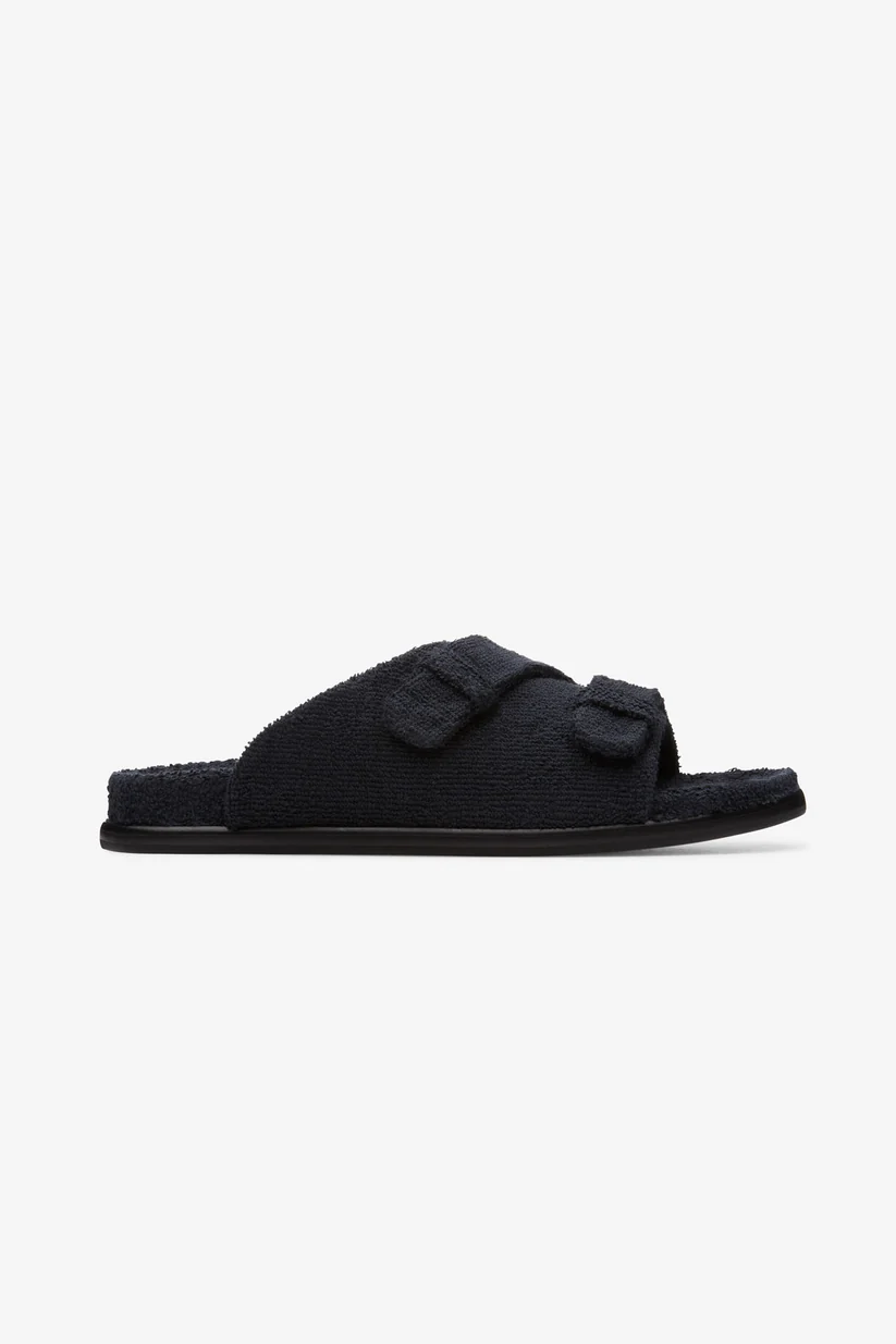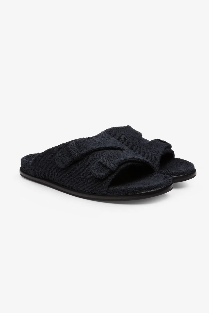 A cozy sandal perfect for summer looks. The shoe features a double velcro strap in black and a terrycloth lining, with a fussbet covered in terry matching the upper. Fastening is through a concealed velcro fastener. The outsole is made of black dyed leather and the tread is rubber.