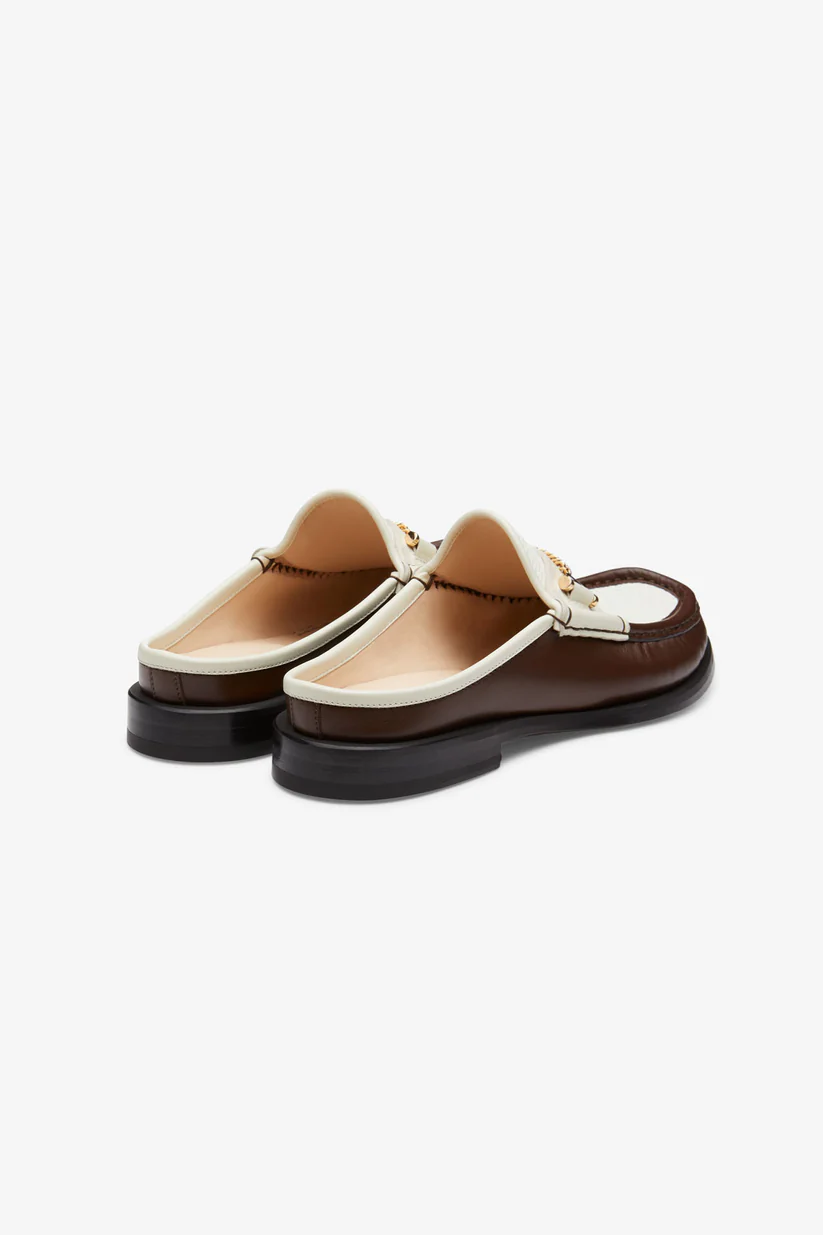 This sabot loafer represents the ultimate shoe for those who do not want to renounce comfort during the warmer season. Distinguished by its characteristic hand-sewn tubular construction, we find it in this version in cozy ebony leather. The bowl is made of compactly textured raffia with milk-white leather inserts. The shoe features shiny gold-plated brass. The black bottom is made of pantographed leather, characterized by an angular shaping. The lining is made of leather.
