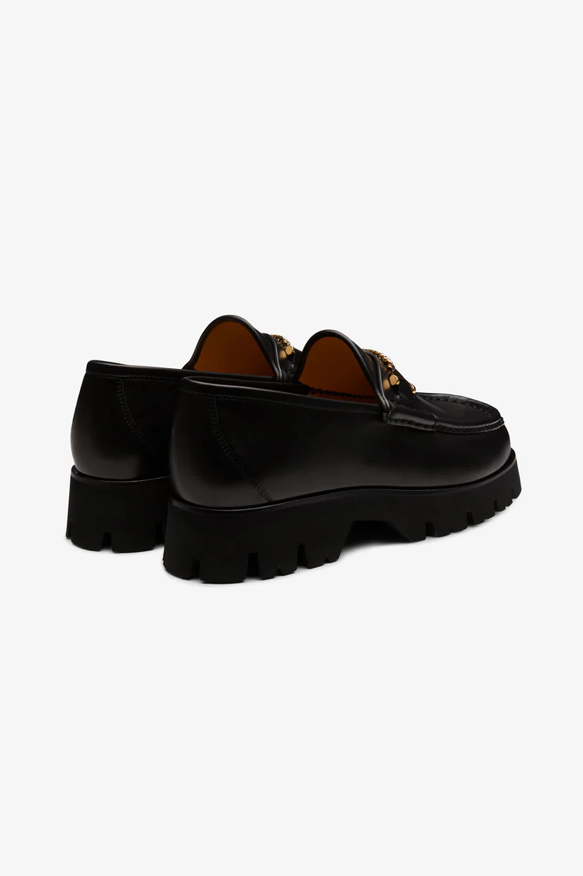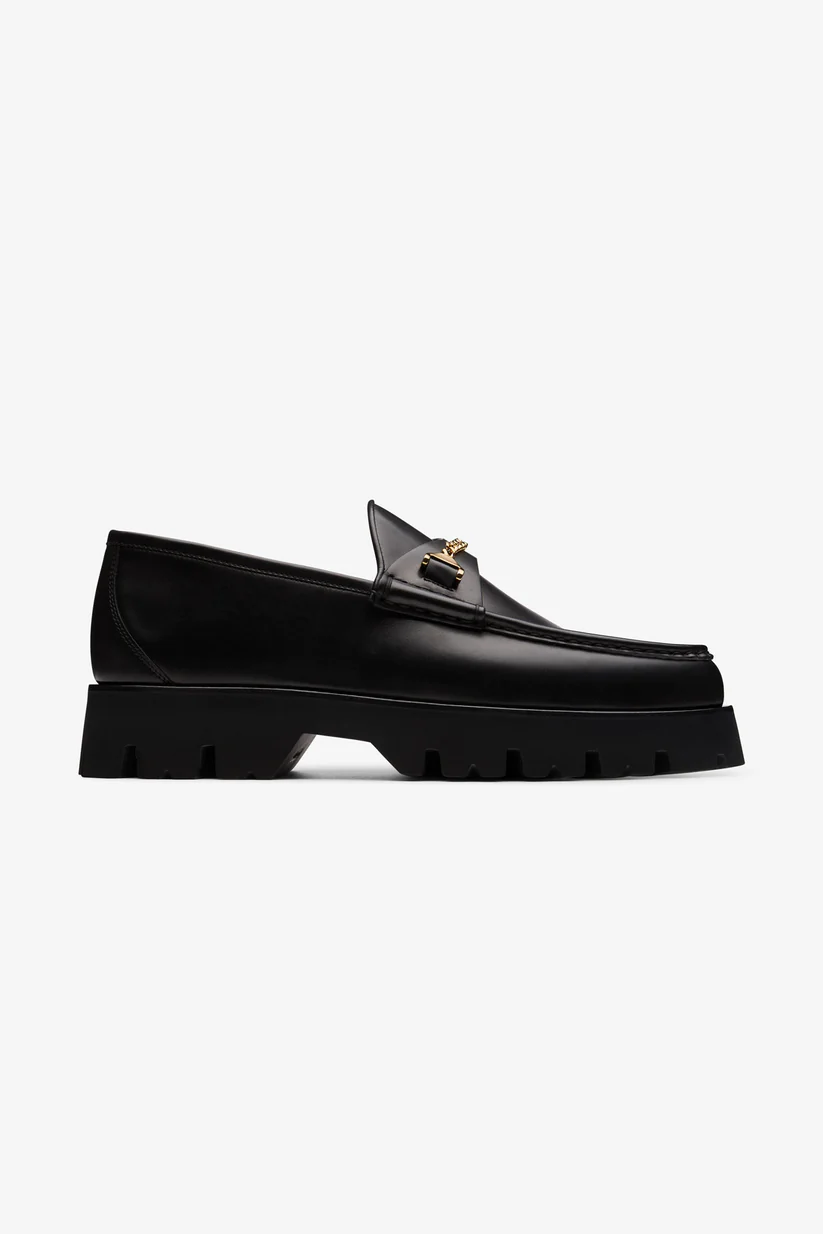 The comfort and versatility of a loafer and the boldness of the 90s effortlessly blend in the Mick Tank loafer. Set on a chunky ridged sole in ultra light EVA rubber, these edgy loafers reveal a sleek hand-sewn construction in premium Italian calf leather and a gold plated brass hardware. Perfect for a statement city style.